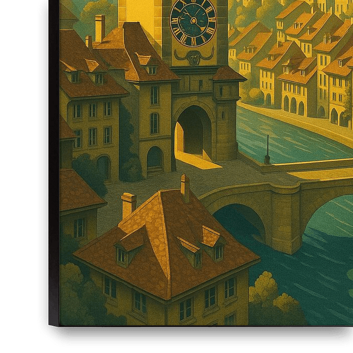 Cette affiche de voyage d'inspiration Art déco capture le charme intemporel de Berne, la capitale de la Suisse, connue pour sa vieille ville classée par l'UNESCO et son architecture médiévale. L'œuvre d'art met en évidence l'emblématique tour de l'horloge Zytglogge, baignée dans une lumière dorée avec des poutres rayonnant à travers la ligne d'horizon. Les tons chauds, jaunes et terreux, reflètent les toits historiques de la ville, le long de la sinueuse rivière Aare, créant ainsi une composition à la fois nostalgique et moderne. Parfaite pour les amoureux de la culture suisse, des villes historiques et de l'architecture européenne, cette œuvre apporte le charme unique de Berne dans votre maison. Imprimée en haute résolution, elle constitue un élément frappant pour les salons, les bureaux ou les espaces créatifs. Que vous soyez un grand voyageur, un admirateur de l'histoire suisse ou un collectionneur d'art mural de style vintage, ce poster de Berne offre une manière sophistiquée de célébrer l'une des villes les plus pittoresques de Suisse. Un cadeau parfait pour les amateurs d'art, les voyageurs ou toute personne passionnée par les destinations européennes classiques.