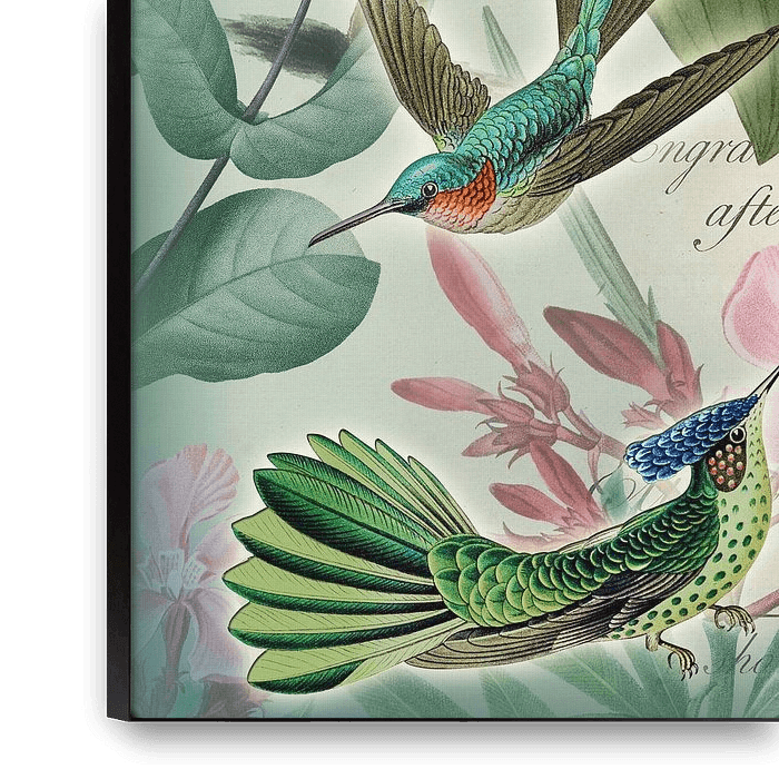 Les colibris sont également appelés "bijoux volants" d'où le titre de l'image. On y voit quatre magnifiques spécimens sur un fond d'illustrations de plantes historiques, combiné à une vieille page de livre et à des dégradés de couleurs.