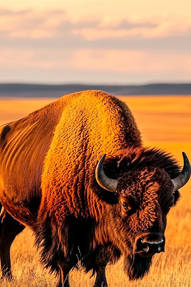 Dans la lumière dorée du crépuscule se tient un bison majestueux, dont le corps puissant domine l'immensité de la prairie. Son impressionnante et épaisse fourrure brille doucement, tandis que les longues cornes sur son front dégagent force et fierté. Entouré de douces collines et d'un ciel infini, il rayonne d'une sérénité intemporelle et incarne la liberté de la nature sauvage.