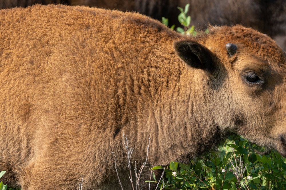 Un bison avec ses petits dans les hautes prairies fleuries du parc d'État de Custer, Dakota du Sud, États-Unis.