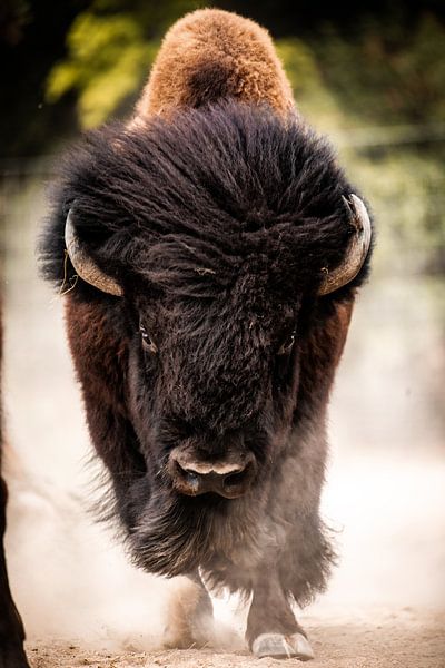 Bison mâle venant vers vous. Ce sont des animaux super impressionnants et surtout quand il vient vers vous comme ça, l'image est complétée par le sable soufflé par le vent.