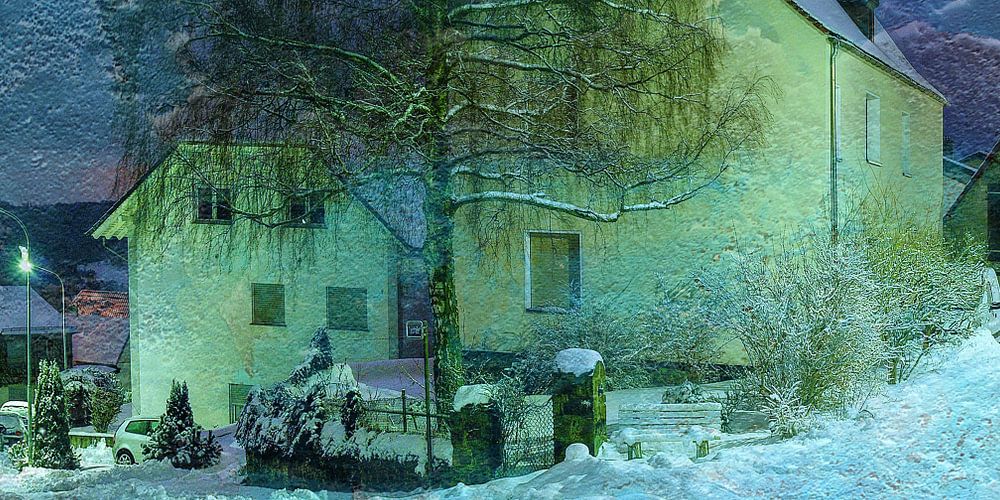Atmosphère de nuit hivernale après les fortes chutes de neige fraîche pendant la journée lors d'une nuit froide et glaciale à Waldsolms-Griedelbach. Au fond, à gauche, les hauteurs du Taunus.