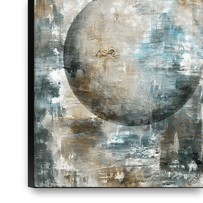 Art abstrait aux tons principalement gris et bleus, techniques mixtes fantastiques