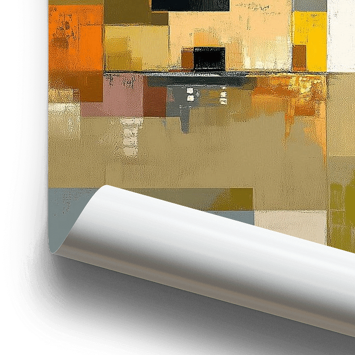 Blocs jaunes | Grille jaune Rythme urbain - Cette peinture abstraite montre de grands blocs jaunes et une grille géométrique serrée de rectangles en ocre et moutarde à côté de zones calmes gris-vert et beige, avec de petits carrés noirs et une texture de peinture visible qui, ensemble, forment une composition de peinture abstraite moderne et chaleureuse - idéale comme peinture abstraite ou peinture abstraite pour ceux qui recherchent une peinture jaune ou une peinture géométrique.