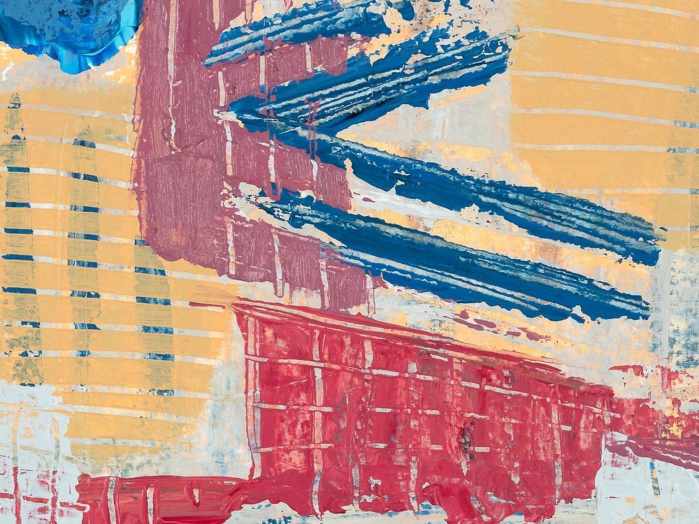 Le tableau "City Blocks" est un paysage urbain abstrait composé de lignes rythmiques, de zones de couleur et de motifs. La composition évoque l'atmosphère d'un environnement urbain. Il s'agit d'une vue d'ensemble de structures, de façades et de plans d'étage. Les couleurs rouge, jaune et bleu créent un contraste puissant et donnent à l'œuvre un aspect graphique. Un paysage urbain en mouvement, composé d'un jeu de formes.
