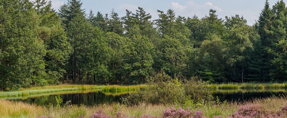 Wijde panorama van een bloeiende hei met daarachter een bos ven en een donker groene bosrand. Het vennetje is te vinden in Natuurgebied de Eese