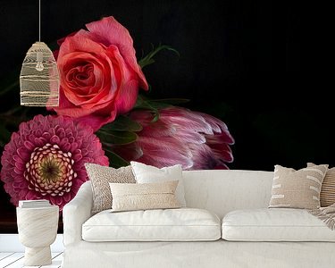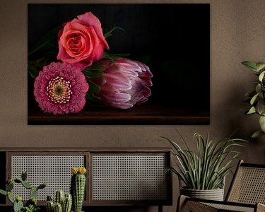 Bloemen in een donkere omgeving met een warme rijke uitstraling. Met behulp van Photoshop heb ik er de suggestie van een olieverfschilderij aan gegeven.