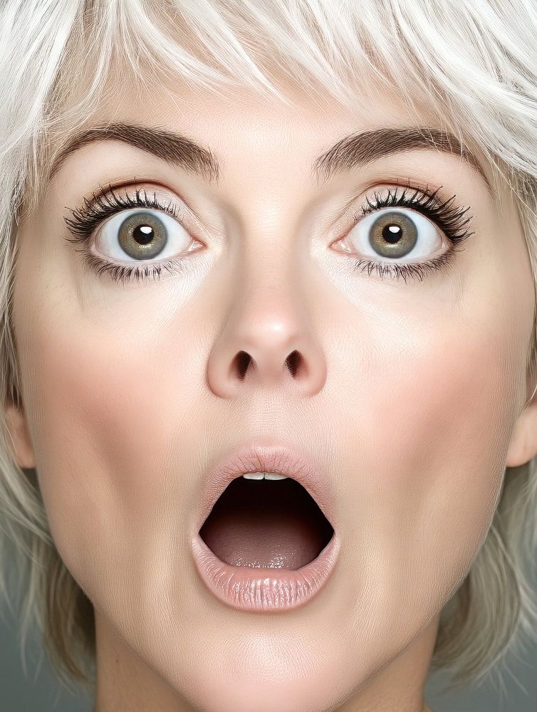 Photo de studio d'une femme blonde surprise, les cheveux en bataille, les yeux grands ouverts et la bouche ouverte. L'expression de son visage évoque l'étonnement et l'incrédulité, tandis que le fond gris met entièrement l'accent sur ses expressions vives.