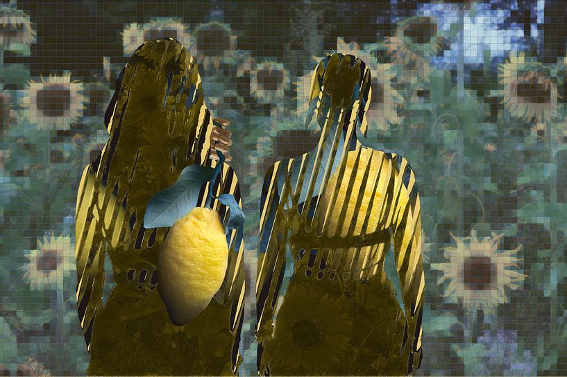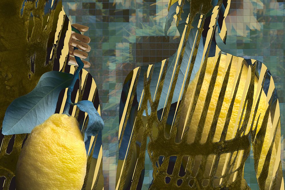 Photographie, collage et traitement graphique en jaune et bleu.
