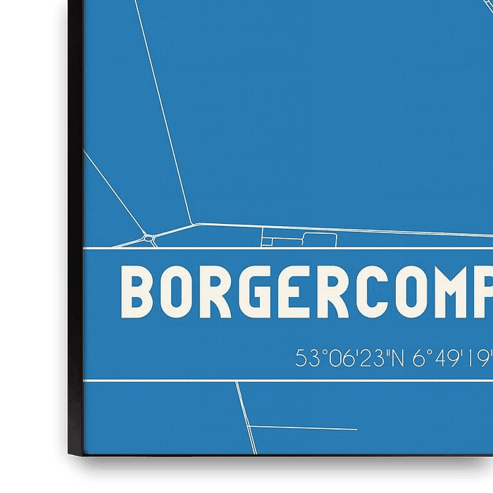 Blueprint de la carte / plan de la ville néerlandaise Borgercompagnie, située dans la municipalité de Veendam, province de Groningen. La carte comprend toutes les routes publiques et les coordonnées du centre de Borgercompagnie.