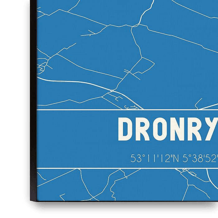 Plan de la carte / carte de la ville néerlandaise Dronryp, située dans la municipalité Waadhoeke, province Fryslan. La carte contient toutes les routes publiques et les coordonnées du centre de Dronryp.