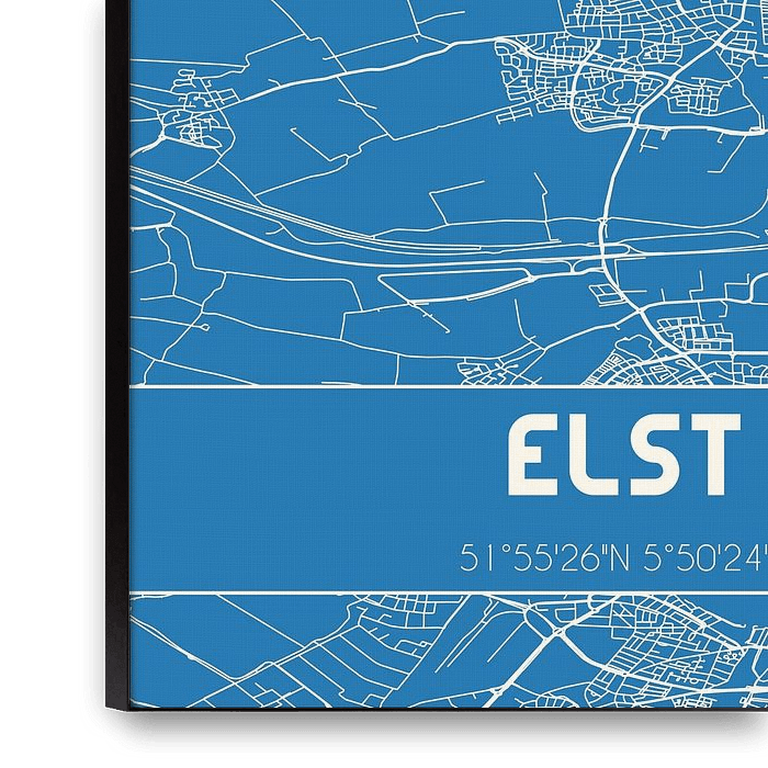 Plan de la carte / plan de la ville néerlandaise Elst, située dans la Betuwe, dans la municipalité d'Overbetuwe, province de Gelderland. La carte comprend toutes les routes publiques et les coordonnées du centre d'Elst.