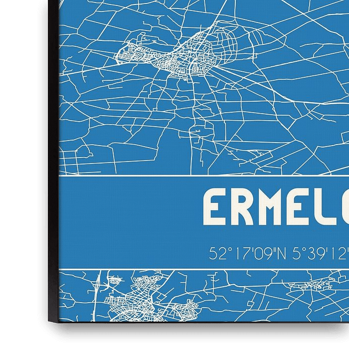 Plan de la carte / plan de la ville néerlandaise Ermelo, située dans la région de Veluwe, dans la municipalité d'Ermelo, province de Gelderland. La carte comprend toutes les routes publiques et les coordonnées du centre d'Ermelo.