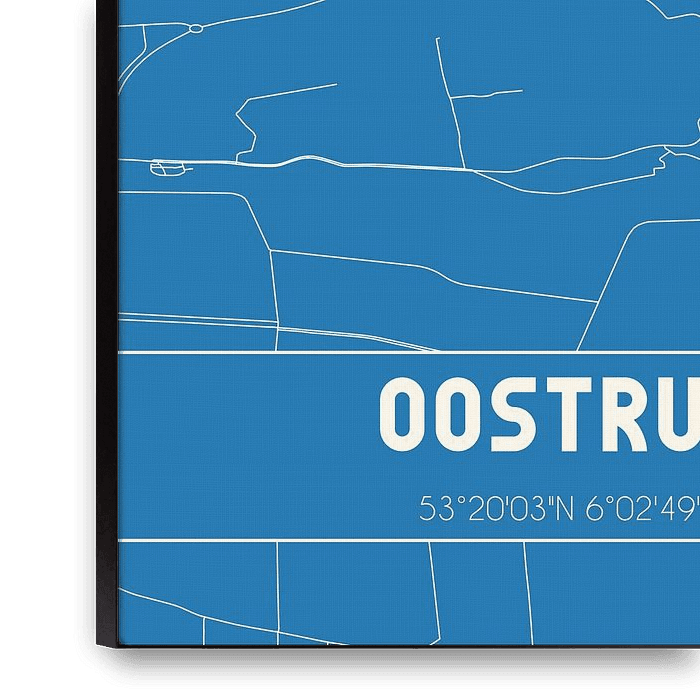 Plan de la carte / plan de la ville néerlandaise Oostrum, située dans la municipalité de Noardeast-Fryslan, province de Fryslan. La carte contient toutes les routes publiques et les coordonnées du centre d'Oostrum.