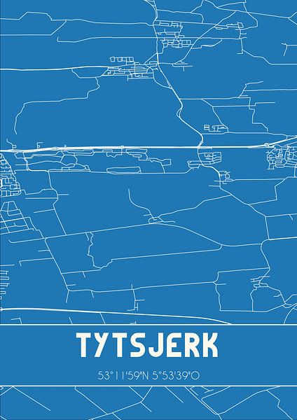 Plan de la carte / carte de la ville néerlandaise Tytsjerk, située dans la municipalité Tytsjerksteradiel, province Fryslan. La carte comprend toutes les routes publiques et les coordonnées du centre de Tytsjerk.