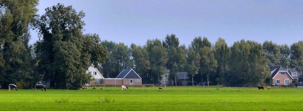 De foto geeft een rustgevend schilderachtig beeld weer. Je ziet koeien grazen in de wei, en woningen, een boerderij, en die fraaie bomen.
