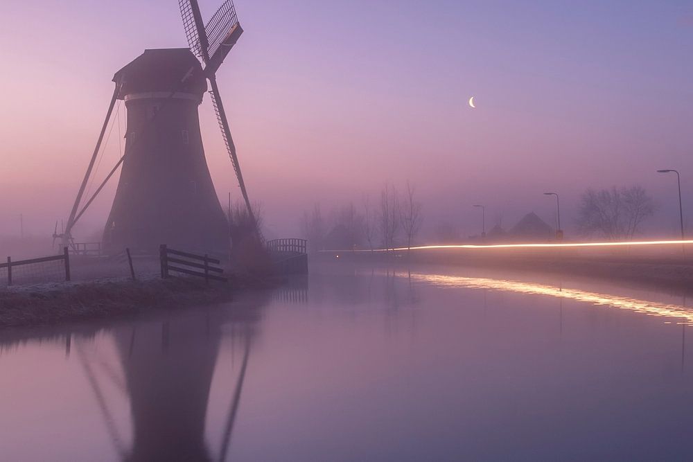 Boezemmolen Nr.6 près de Haastrecht avant le lever du soleil par un froid matin d'hiver avec de la brume.