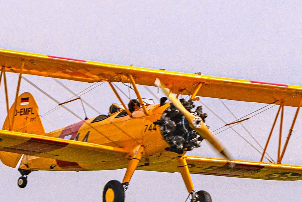 Un biplan jaune, immatriculé D-EMFL, vole sous les rayons du soleil dans un ciel nuageux. Cet avion historique, un Boeing-Stearman PT-17 Kaydet, dégage un air de nostalgie.