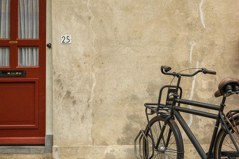 À côté de la boîte aux lettres se trouve une bicyclette d'homme à l'ancienne. Tous deux se détachent magnifiquement du mur pavé jaune pâle.