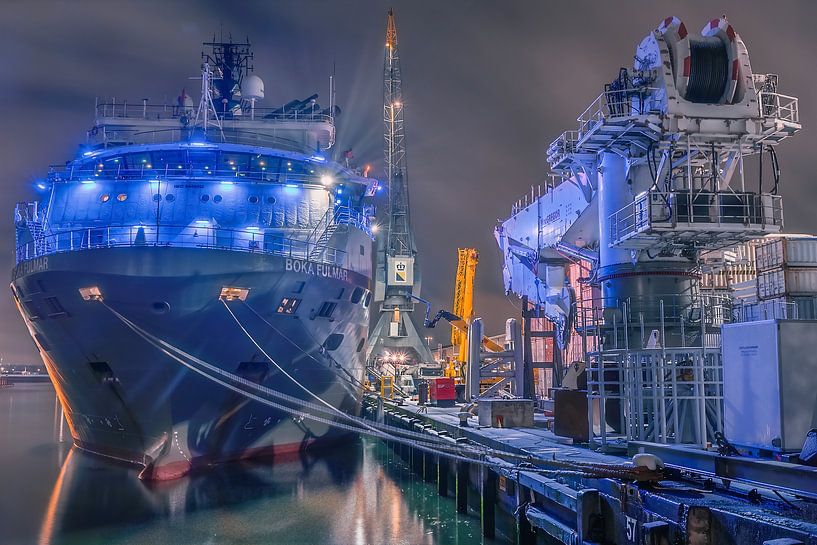 Par une nuit d'hiver glaciale, le Boka Fulmar est amarré dans le Waalhaven de Rotterdam. Le navire est baigné d'une lumière de travail bleue, entouré d'installations industrielles lourdes et de grues silencieuses. Cette photo est une prise de vue HDR, construite à partir de plusieurs expositions pour capturer la nuit noire ainsi que les…