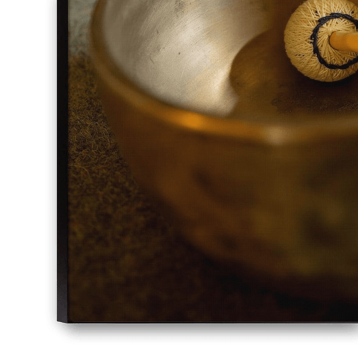 Cette photographie atmosphérique montre un bol chantant dans des tons chauds, avec une mise au point douce et une lumière naturelle soulignant la tranquillité et la simplicité du moment. La texture du métal, l'aspect usagé du bol et la tête du batteur enveloppée de fil de fer contribuent à donner une impression d'authenticité et d'artisanat. L'arrière-plan flou dans des tons naturels renforce l'atmosphère sereine et méditative, sans détourner l'attention du sujet.