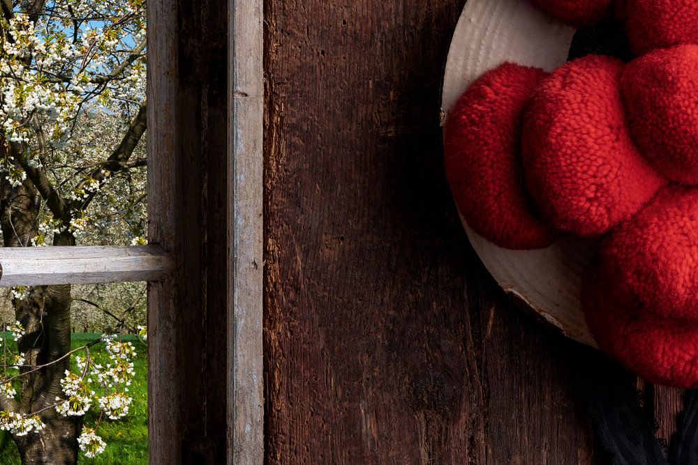 salon rustique de la ferme avec Bollenhut et vue de la fenêtre sur le jardin, prise de vue en studio