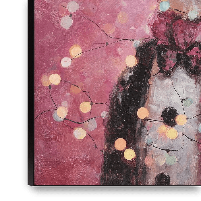 Sneeuwpop in Lichtjes - Een uitbundige sneeuwpop die zichzelf lijkt te vieren, omhuld door een regen van kerstlichtjes — dat is de eerste indruk die blijft hangen. Het sneeuwpop schilderij zet in op twee knallende elementen: het vriendelijke hoofd met zijn lange wortelneus en hoge zwarte hoed, en de loshangende, warme lichtjes die als dansende stippen voor- en achterlangs bewegen. De compositie is bedoeld om meteen een glimlach te brengen: een klassiek winterfiguur in een onverwacht speelse setting, tegen een roze achtergrond die het beeld modern en verrassend maakt. Als schilder is hier bewust gekozen voor grote, voelbare verfstreken zodat je bijna de structuur van sneeuw en hoed kunt voelen met je ogen.
