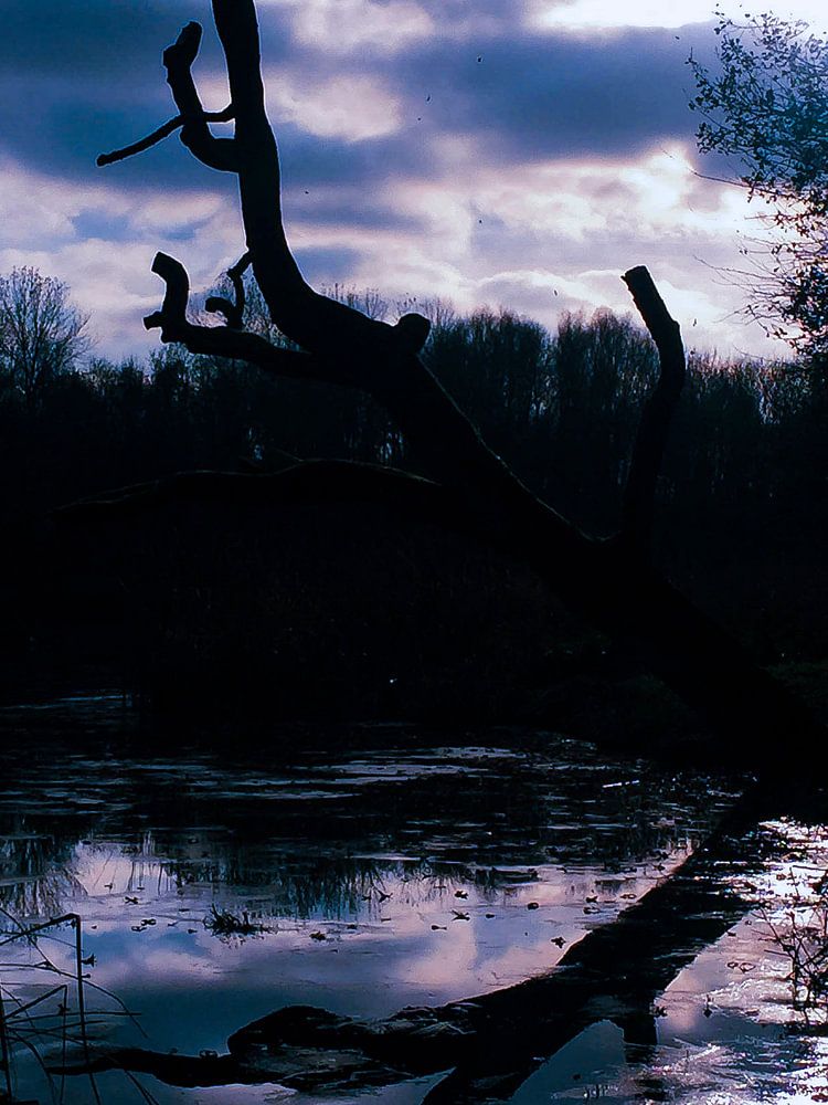 Een prachtige kale boomstam boven (half) bevroren water. De schaduw weerkaatst op het water wat voor een mooie compositie zorgt.