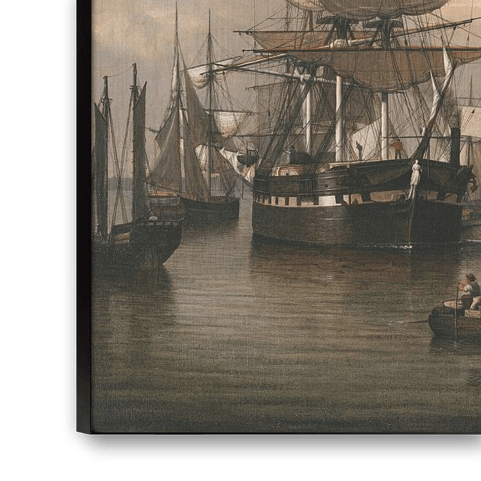 Les types de navires de diverses perspectives - une vue de face d'une grande écorce à arêtes carrées à gauche ; une vue de bâbord d'un paquet de navires à vapeur qui se déplace dans la scène au centre ; et une vue de profil d'un clipper moderne aux lignes pures et à la coque pointue à droite. Ceux-ci et un éparpillement de remorqueurs, de bateaux de pêche et d'autres embarcations sont naturellement placés autour du port, tout comme l'artiste a pu les observer.
