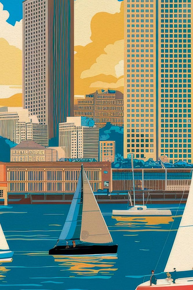 Un paysage urbain vivant qui capture la ligne côtière dynamique de Boston. Des voiliers glissent doucement sur l'eau, tandis que d'imposants gratte-ciel s'élèvent vers le ciel, entourés d'un ciel d'un bleu éclatant. Cette représentation nostalgique convient parfaitement au salon pour donner un sentiment d'aventure et d'ambiance urbaine.