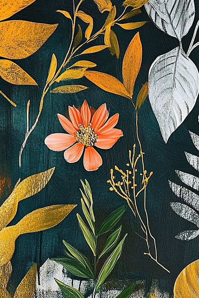 Botanique - Medley of Serenity Leaves - Cette peinture florale montre une diversité de feuilles et une seule fleur, exécutée dans une palette colorée sur un fond sombre et texturé, qui accentue les éléments botaniques en or, jaune et argent.