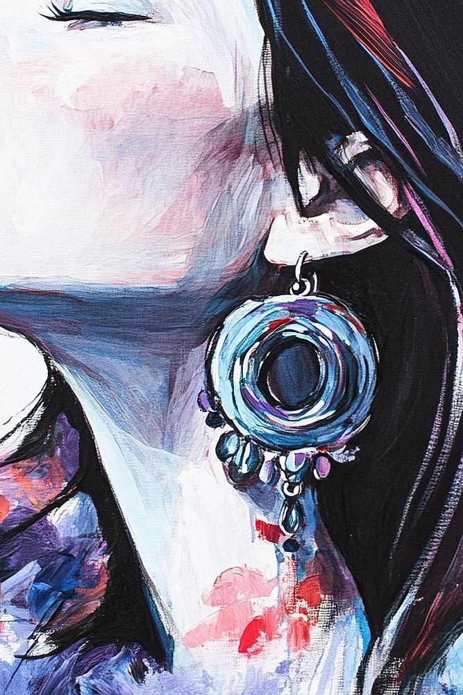 Femme boucle d'oreille - Cette peinture pour femmes montre une femme avec une grande boucle d'oreille bleue frappante et un regard serein, entourée de traînées de peinture colorées qui dégagent un sentiment de calme et de méditation.