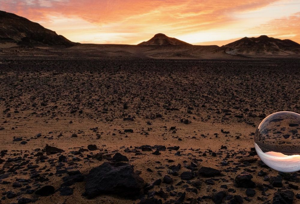 Cette photo a été prise dans le désert noir en Egypte.Ce désert est caractérisé par du sable brun contenant des roches de lave noires.Les montagnes que l'on peut voir sont souvent des volcans qui ont craché la lave noire lors d'éruptions dans un passé lointain.Au premier plan, on peut voir une boule de cristal qui donne une belle image que la photo plus grande montre également Malgré la sécheresse, il y avait des nuages qui ont fait que le coucher de soleil vaut la peine d'être capturé.