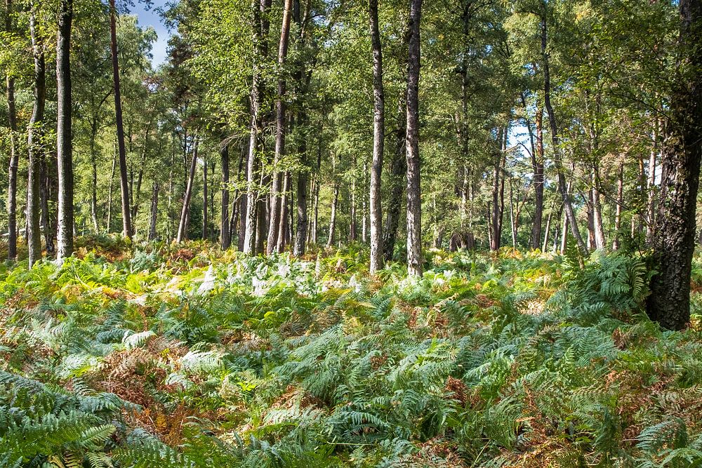 Paysage forestier de bouleaux argentés et de fougères près du Posbank, au-dessus de la ville de Rheden, dans la province de Gelderland. Cette photo a été prise à la fin de l'été 2022