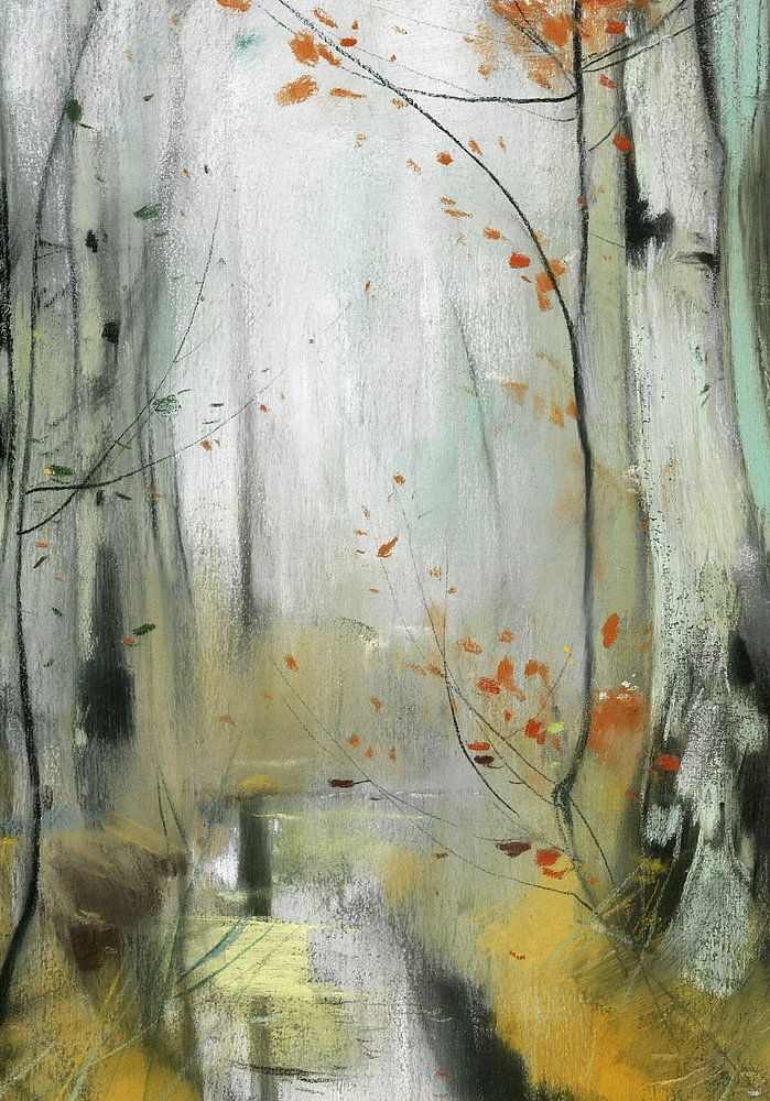 Un certain nombre d'arbres de la variété des bouleaux se dressent autour d'un ruisseau, un fossé envahi par la végétation. L'atmosphère parle clairement de l'automne et les couleurs orange et jaune sont dominantes dans ce morceau de nature dans la brume.