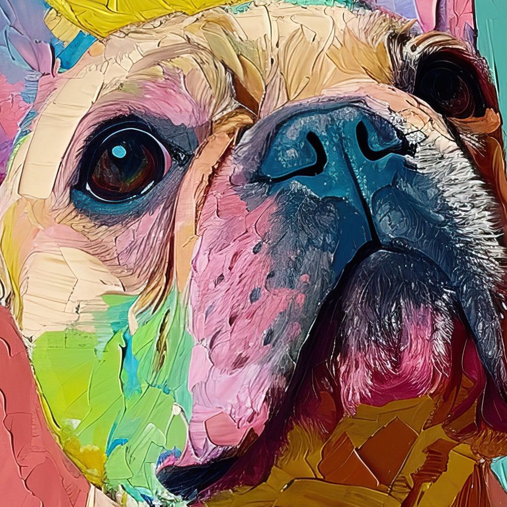 Bulldog - Sur cette œuvre expressive, nous voyons un bouledogue français, vif et avec de grands yeux qui cherchent à établir une connexion instantanée avec le spectateur. Le style est moderne, avec des peintures épaisses et texturées, tandis qu'une palette ludique de jaune, de bleu et de rose met en valeur la personnalité joyeuse du chien. Les couleurs audacieuses et accrocheuses offrent un contraste visuel dynamique qui dynamise instantanément n'importe quel espace.