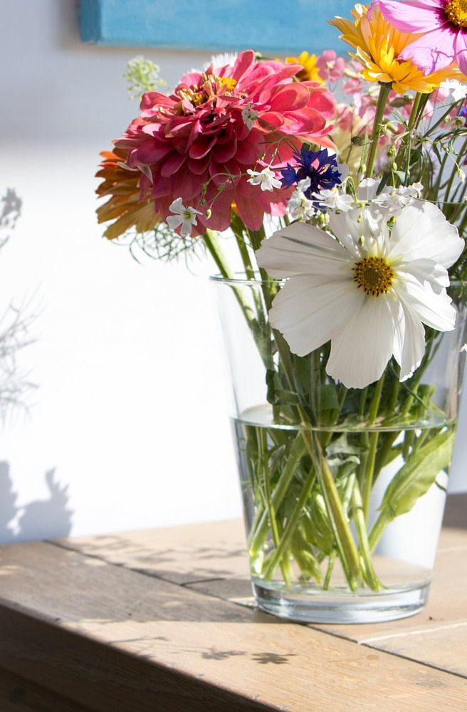 Des fleurs colorées dans un vase, à l'ombre du soleil.