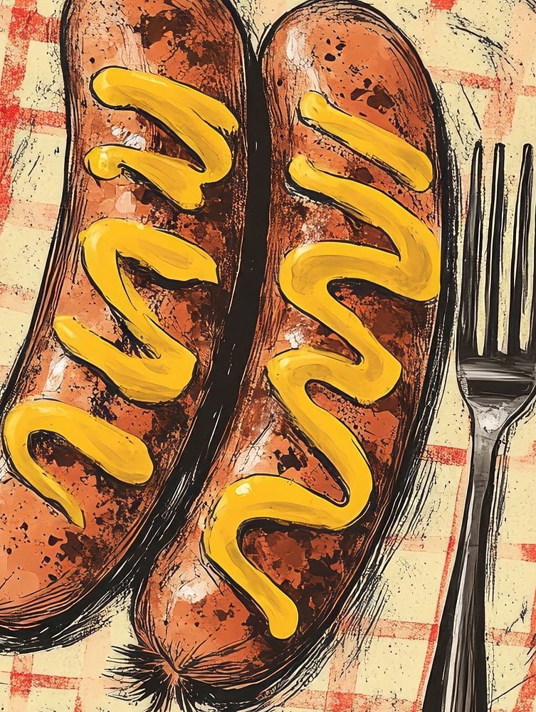 Une assiette avec deux saucisses frites, garnies de moutarde, sur une serviette à carreaux. Cette illustration est à la fois ludique et appétissante - une ode à la simplicité et à la convivialité allemandes.
