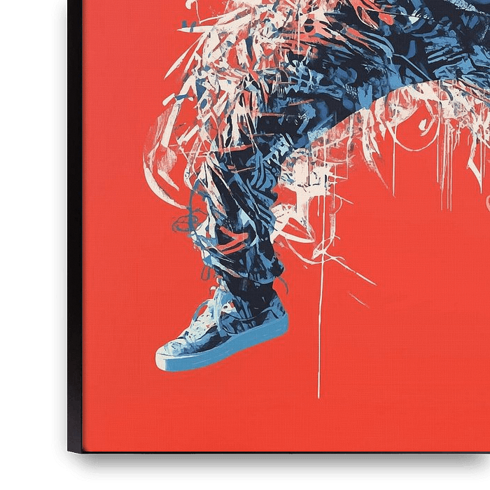 Œuvre d'art dynamique représentant un breakdancer en mouvement sur un fond rouge audacieux. Des coups de pinceau expressifs en bleu et blanc capturent l'énergie et le rythme de la danse de rue, mêlant des éléments abstraits à un style urbain.