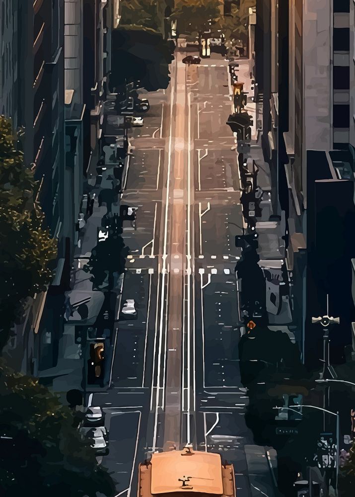 "Le charme du téléphérique de San Francisco met en valeur l'attrait iconique et nostalgique d'un téléphérique descendant une rue escarpée de San Francisco. La scène est baignée par la chaude lueur du soleil couchant, qui projette une lumière dorée sur les bâtiments et crée un paysage urbain pittoresque. La perspective en hauteur met l'accent sur le célèbre terrain vallonné de la ville, capturant ainsi le charme et le caractère uniques de San Francisco.