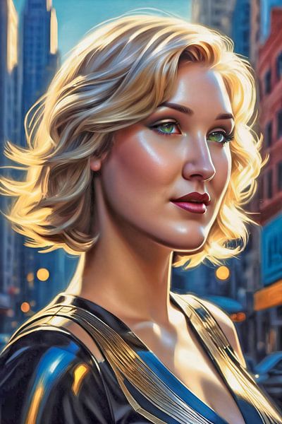 Bridget rend un brillant hommage à l'esthétique hollywoodienne classique des années 1930 et 1940, interprétée dans un style graphique d'inspiration Art déco. L'image présente un très faible degré d'abstraction. Elle est fortement axée sur le réalisme en ce qui concerne les traits du visage et la mise en lumière, bien qu'il s'agisse d'un…