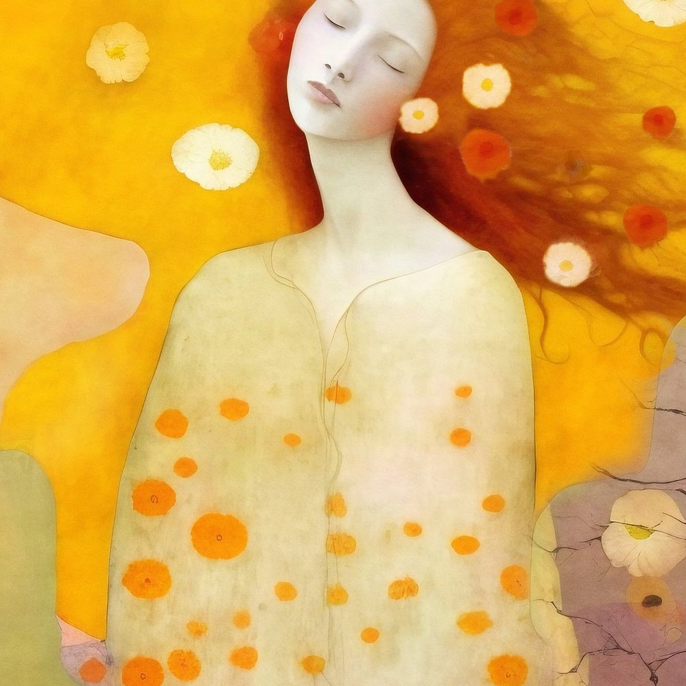Collage dans des tons pastel avec le portrait d'une femme profitant d'une brise d'été. Illustration en technique mixte sur papier.