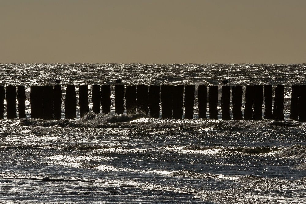 Dans l'heure d'or, le rétro-éclairage donne un bel effet. La lumière brille magnifiquement sur les vagues. Les brise-lames sur la plage de Domburg offrent un beau contraste.