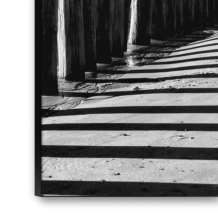 Une image désormais classique. Deux rangées de brise-lames sur la plage de Domburg en Zélande. Le faible ensoleillement crée un contraste très fort à travers les ombres des pôles.