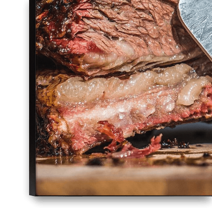 Cette photo de nourriture montre un magnifique morceau de poitrine de bœuf BBQ artisanal, photographié avec le souci du détail et de la texture. Les couleurs chaudes et le contraste donnent vie à l'expérience gustative. Une image puissante et pleine de caractère qui s'intègre parfaitement dans une cuisine, une grotte, un bar ou un…