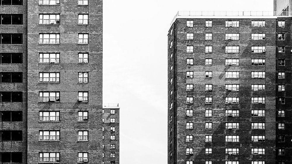 Des complexes d'appartements à Brooklyn en noir et blanc.