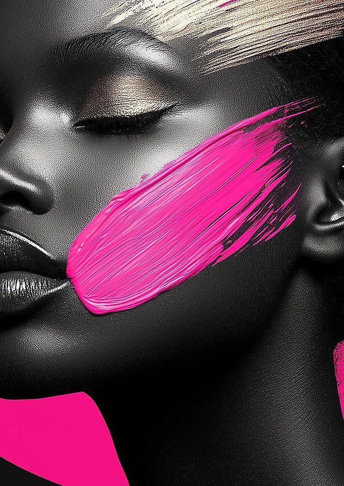 Photographie en noir et blanc d'une femme élégante dont le visage est orné de subtils coups de pinceau roses et dorés, exécutés dans un style minimaliste. Un cercle rose foncé est placé derrière sa tête, formant un arrière-plan doux et sophistiqué et donnant à la composition une touche moderne et élégante. La combinaison de la photographie monochrome avec les couleurs chaudes des coups de pinceau et du cercle crée un équilibre harmonieux entre simplicité et élégance.