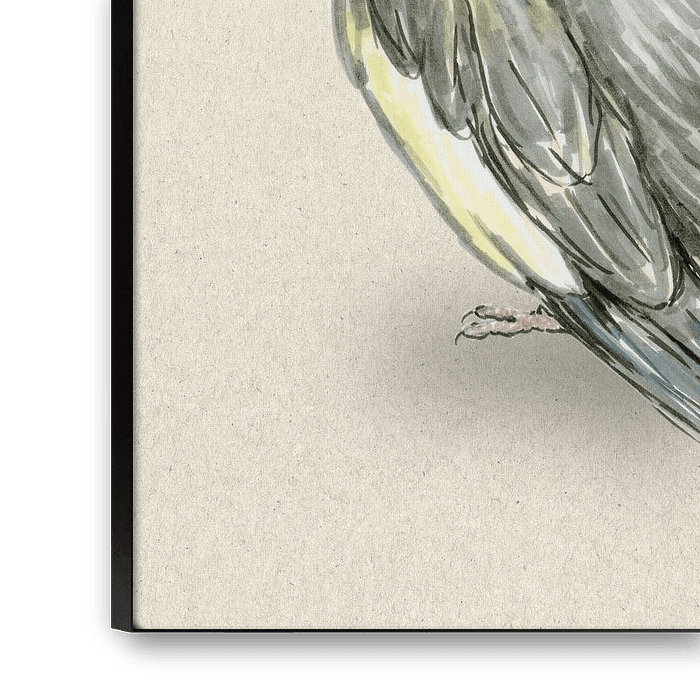 Un dessin avec des marqueurs aquarelle et des feutres d'un cockatiel qui se brosse les plumes de la queue. C'est une femelle. Elle tient la plume extérieure de la queue dans son bec et cette plume fait une belle courbe. Le reste de sa queue est étalé en éventail. L'oiseau est principalement gris avec des accents jaunes. L'arrière-plan est une texture chaude de papier.
