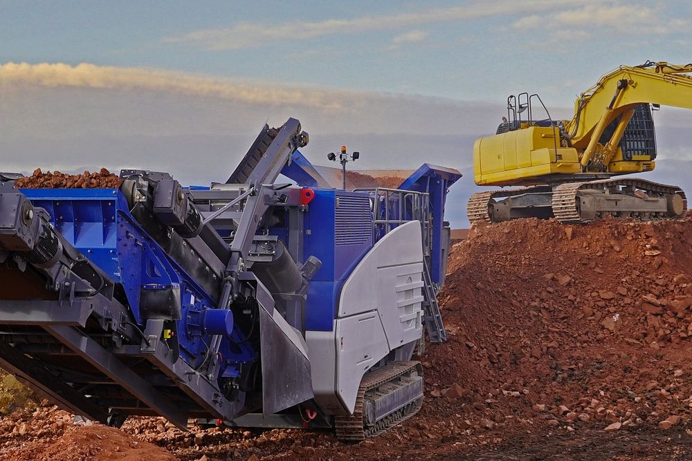 Broyeur de pierres et pelleteuse en action au lever du soleil