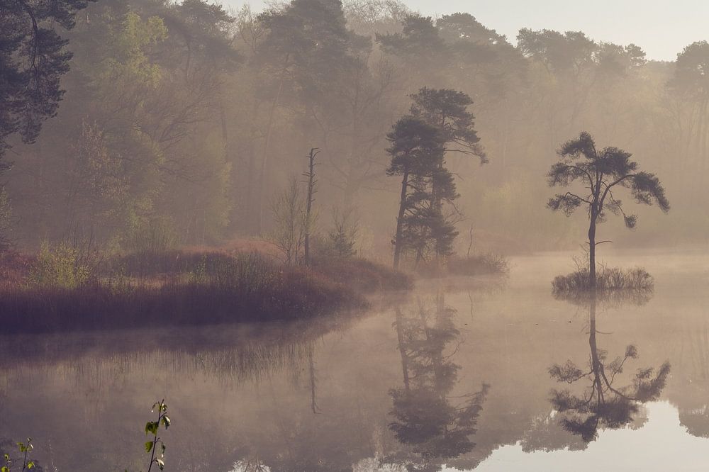 Sur cette photo prise par une belle matinée de printemps en mai, nous voyons la brume au-dessus de la tourbière disparaître lentement sous l'effet de la chaleur du soleil qui vient de se lever. Au premier plan, nous voyons de la végétation, avec derrière elle l'eau calme de la tourbière, et derrière elle encore les arbres qui forment le bord de la tourbière.
